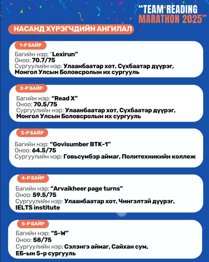 Lingors боловсролын байгууллагаас зохион байгуулсан англи хэлээр унших, сонсох, ярих чадварыг хөгжүүлэх зорилготой “Team Reading Marathon” буюу багаар унших уралдаанд улсын хэмжээнд нийт 706 багийн 3530 суралцагч, 195 чиглүүлэгч багш оролцлоо.