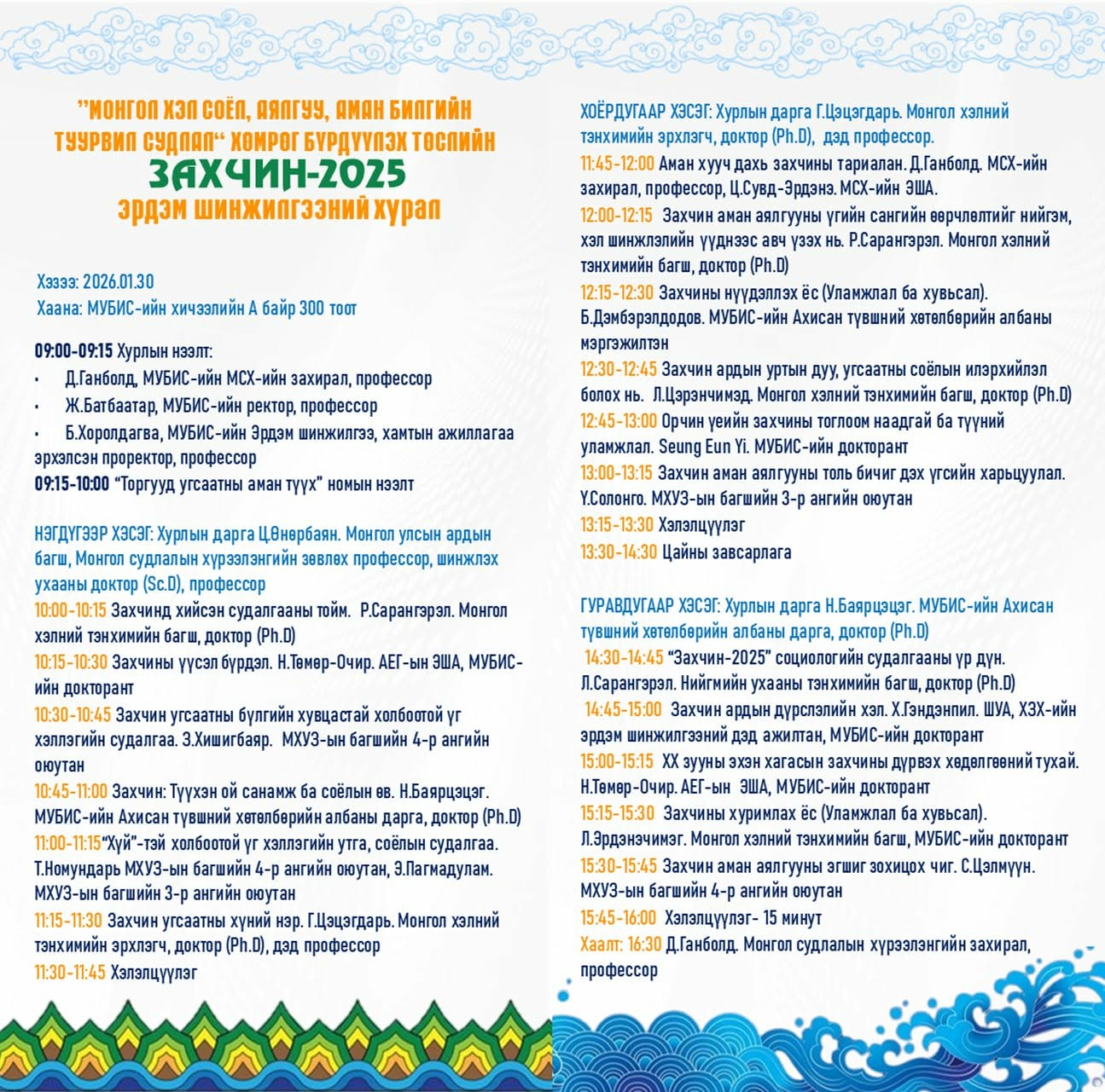 МУБИС-ийн Монгол судлалын хүрээлэнгээс “Монгол хэл соёл, аялгуу, аман билгийн туурвил судлал” хөмрөг бүрдүүлэх төслийн хүрээнд зохион байгуулж буй “Захчин 2025” эрдэм шинжилгээний хурал өнөөдөр болов. Хурлыг Монгол судлалын хүрээлэнгийн захирал, профессор Д.Ганболд нээж, МУБИС-ийн Ректор, профессор Ж.Батбаатар болон удирдлага, багш судлаачид, суралцагчид, хүндэт зочид уригдан оролцсон юм.